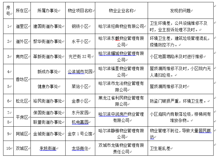 近期,市区物业主管部门在监督检查中发现的服务质量较差、业主反映较为强烈的10个住宅小区、9家物业服务企业进行通报,对相关企业予以信用扣分,计入企业信用档案,依据《哈尔滨物业服务企业信用评价管理办法》有关规定予以惩戒。
