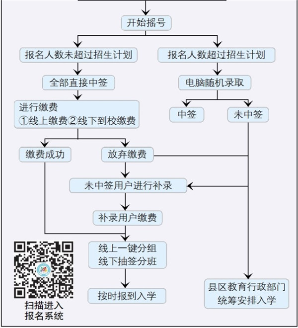 民办义务教育学校严格执行免试入学政策。对报名人数超过招生计划的学校,实行电脑随机录取,随机录取比例为当年招生计划的100%。报名人数未超过当年招生计划的,直接录取。跨区报名人数超过剩余计划数的,按剩余计划数100%电脑随机录取。跨区报名人数未超过剩余计划数的,直接录取。