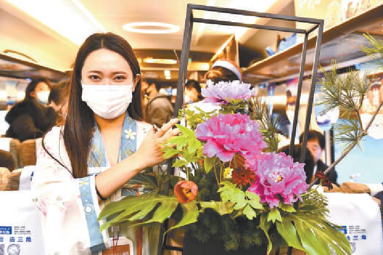 12月26日,在菏泽东至北京南的列车上,一位工作人员在展示牡丹插花作品。 新华社记者 郭绪雷摄