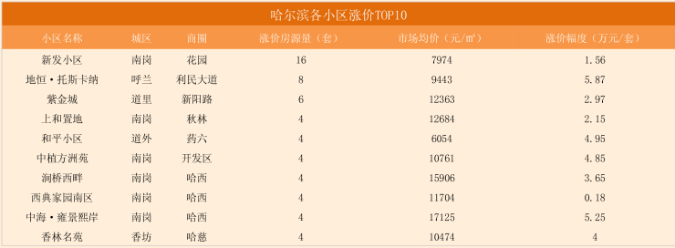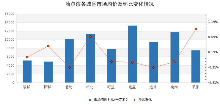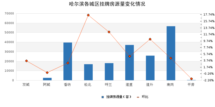 2、平房环比涨幅居首,南岗挂牌房源量先进