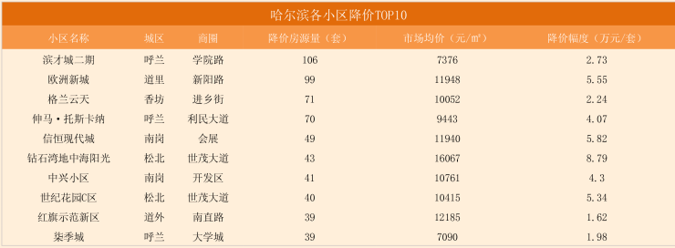 新发小区小区涨价房源量居首,滨才城二期降价房源量居首:本周新发小区小区涨价房源量为16套,数量居首,市场均价为7974元/㎡,涨价幅度为1.56万元/套。滨才城二期降价房源量居首,为106套,市场均价为7376元/㎡,降价幅度为2.73万元/套。