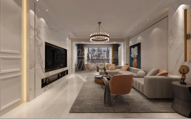 本案定义为现代轻奢风,现代轻奢是将材料、色彩、灯光及元素进行简化,以实用的功能性家具为主,用简洁的视觉效果营造出时尚前卫的家居氛围。
