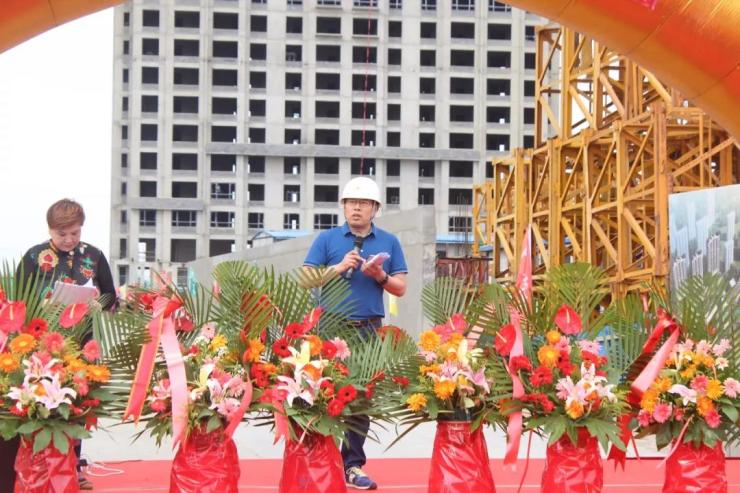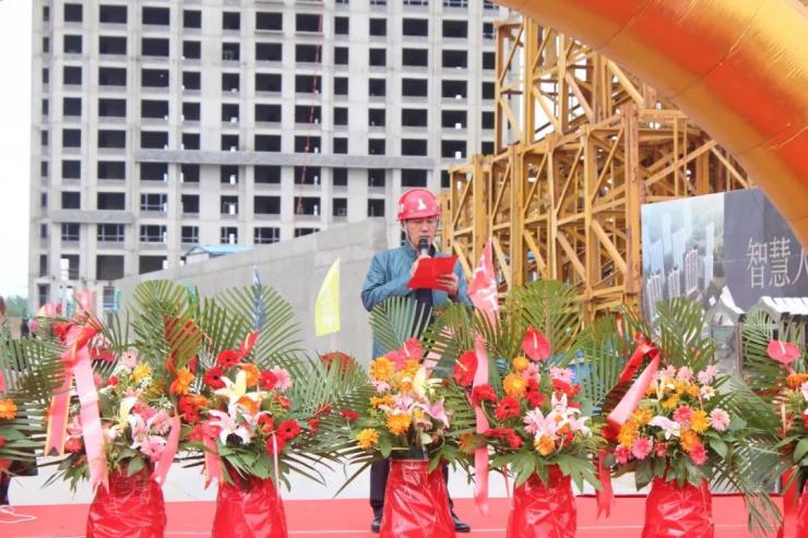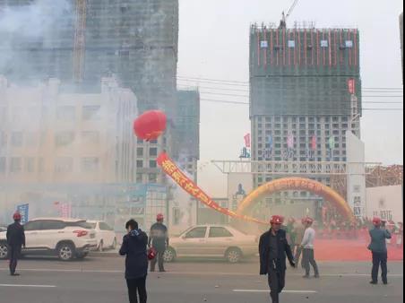 大家欢聚在工地等待吉时封顶,下午2点08分,随着主持人上台宣布仪式正式开始,炮竹声不绝于耳,鞭炮齐名,彩旗飘飘,到场观摩的嘉宾共同见证了这一隆重时刻。