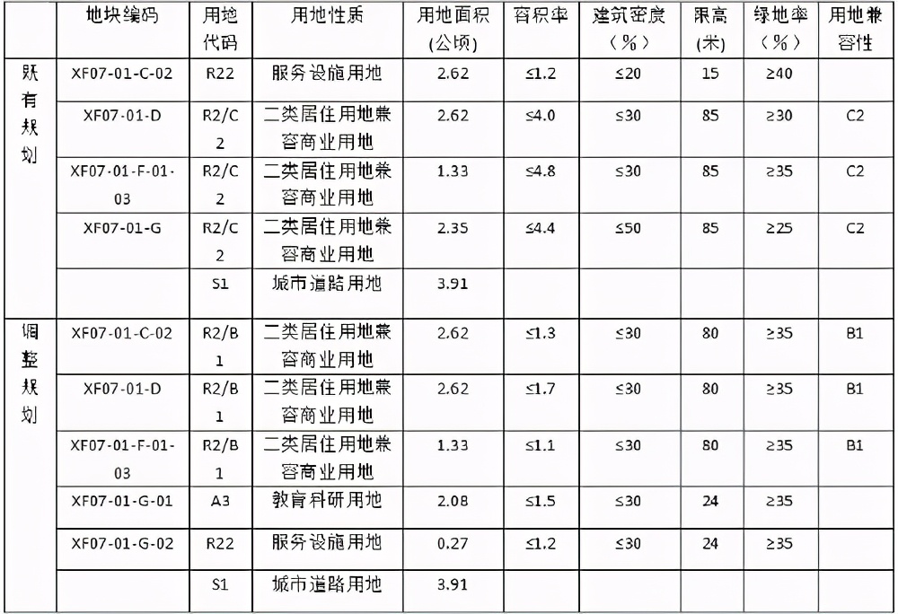 (1)规划确定地块编号XF07-01-C-02为二类居住用地兼容商业用地(R2/B1),容积率为不大于1.3,建筑密度不大于30%,绿地率不小于35%,建筑限高为80米。