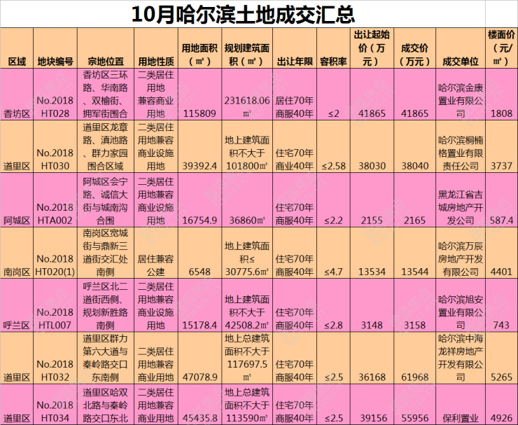 10月成交的7宗地块,楼面较高价为5265元/㎡,是中海地产竞得的No.2018HT032地块,位于道里区群力第六大道与秦岭路交口东南侧,溢价率71.3%,其次为保利置业摘牌的No.2018HT034地块,位于道里区哈双北路与秦岭路交口东北侧,楼面价4926元/㎡,溢价率42.9%。与其余地块几乎底价成交相比,这两宗群力地块竞争激烈,溢价率和楼面价均处于高位。