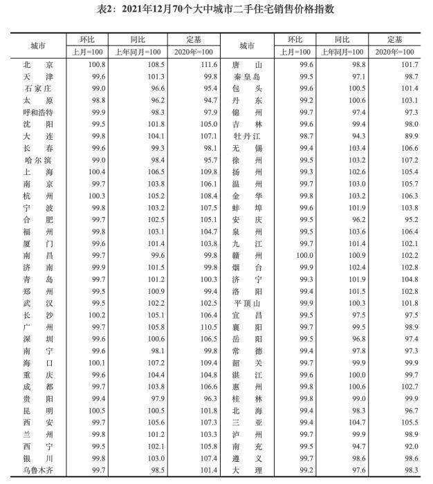 2021年12月70个大中城市二手住宅销售价格指数。 截图自国家统计局官网