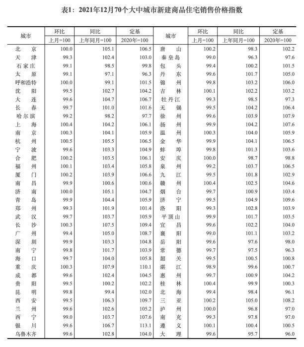 2021年12月70个大中城市新建商品住宅销售价格指数。 截图自国家统计局官网