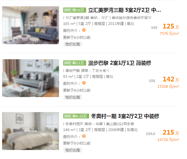 截取大中小各种不同户型中降价幅度较大的房源如下,来自香坊区立汇商圈立汇美罗湾小区,建面165㎡的五室两厅房源,总价下降10万;来自道里区工农大街商圈漫步巴黎小区,建面93㎡的两室一厅房源,总价下降13万;来自南岗区会展商圈冬奥村一期小区,建面146㎡三室两厅房源,总价下降0.1万。