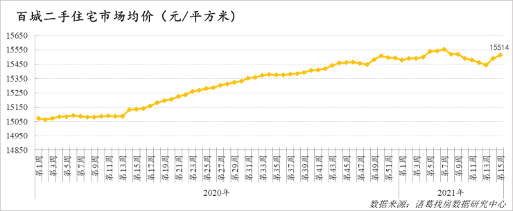 据诸葛找房数据研究中心监测数据显示,2021年第15周百城二手住宅市场均价为15514元/平方米,环比上涨0.15%,涨幅较上周回落0.16个百分点。本周二手住宅市场均价延续上周上涨态势,市场均价受到部分城市调控政策的影响小幅震荡,整体来看,二手房市场基本保持平稳运行态势。