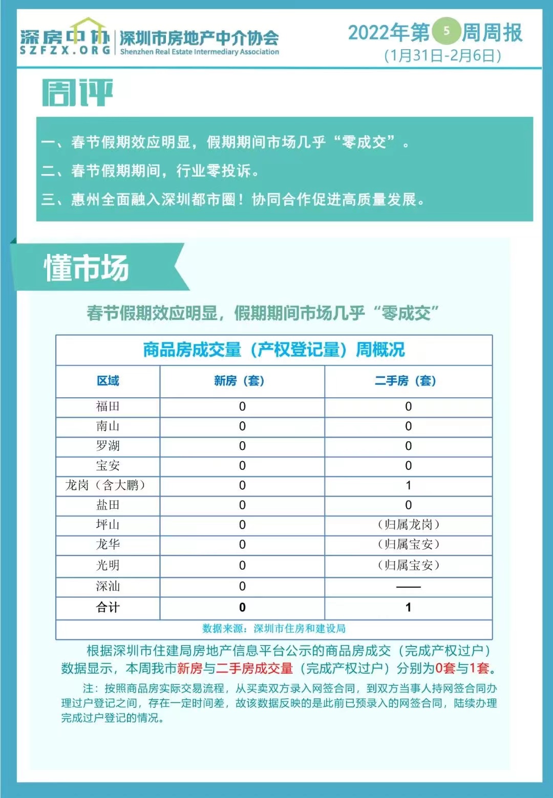 2月7日,深圳市房地产中介协会发布的周报数据显示,春节假期效应明显,假期期间市场几乎“零成交”。