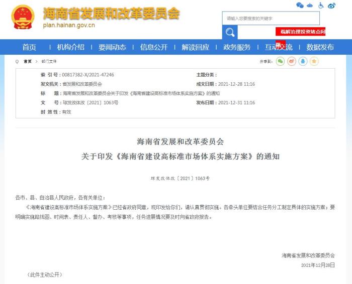 中新财经1月4日电 据海南省发展和改革委员会网站消息,《海南省建设高标准市场体系实施方案》近日印发。