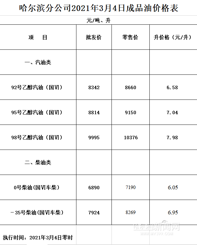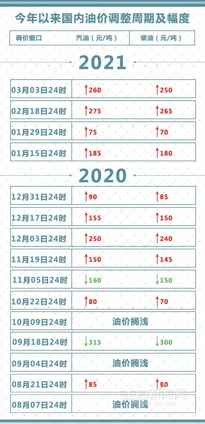 3日,省发改委接到国家发展改革委发布的国内成品油调价信息后,对我省成品油价格实施调整,自2021年3月3日24时起,我省汽、柴油价格(标准品)每吨分别提高260元和250元。
