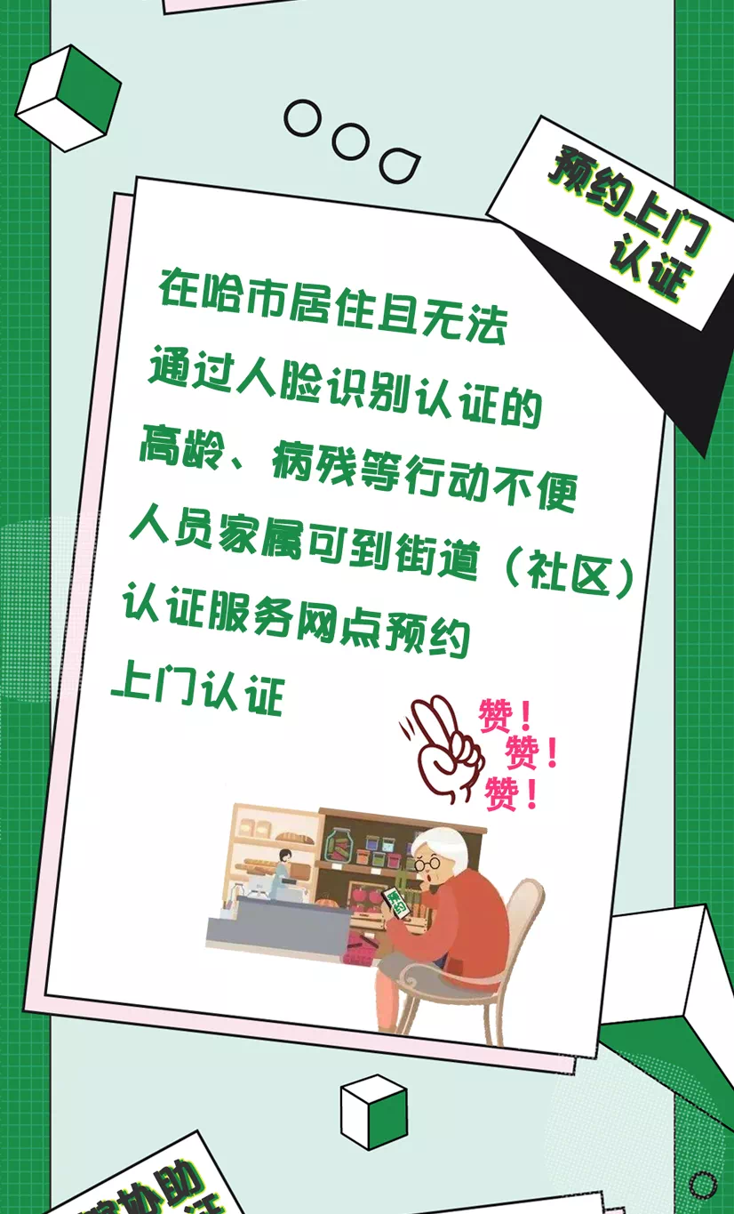 在哈尔滨市居住且无法通过人脸识别认证的高龄、病残等行动不便人员家属可到街道(社区)认证服务网点预约上门认证。