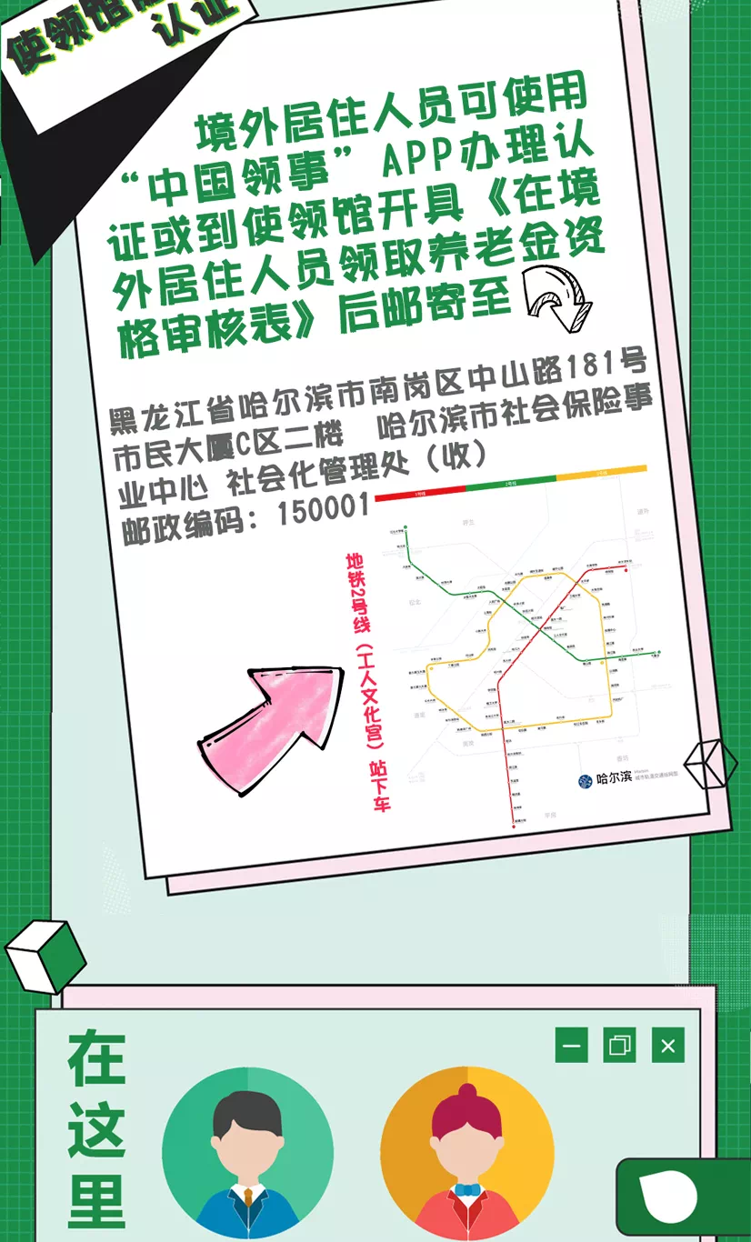 境外居住人员可使用“中国领事”APP办理认证或到使领馆开具《在境外居住人员领取养老金资格审核表》后邮寄至哈尔滨市社会保险事业中心 。邮寄地址:黑龙江省哈尔滨市南岗区中山路181号市民大厦C区二楼 哈尔滨市社会保险事业中心 社会化管理处收,邮政编码:150001。