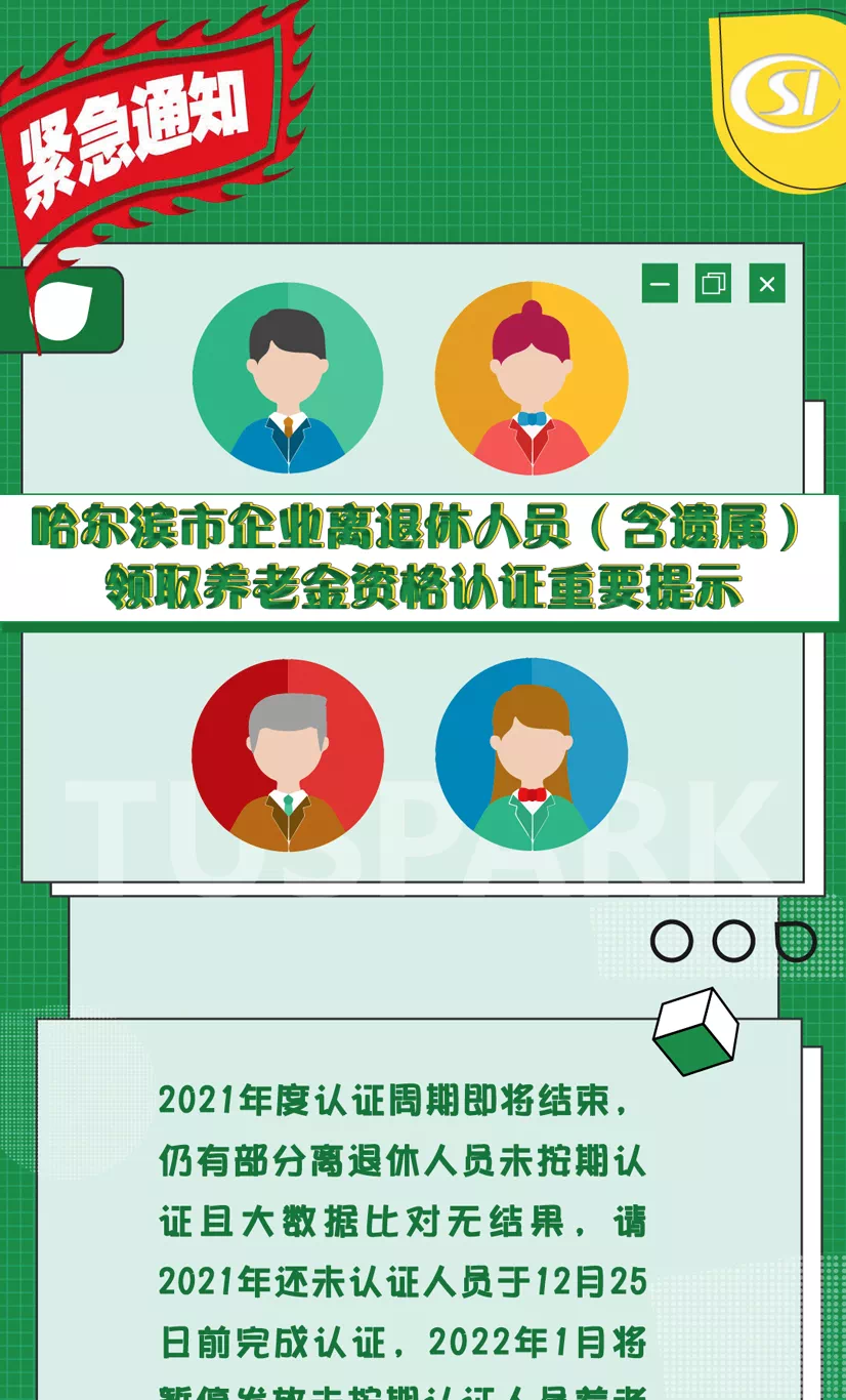 2021年度哈尔滨市企业离退休人员领取养老金资格认证周期即将结束,仍有部分离退休人员未按期认证且大数据比对无结果。哈尔滨市人社局提醒相关人员,请2021年还未认证人员于12月25日前完成认证,2022年1月将暂停发放未按期认证人员养老金。
