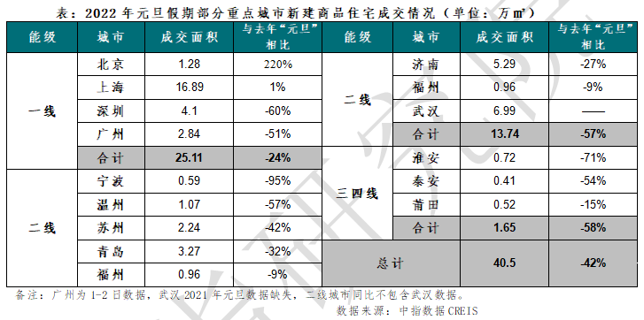 中国经济网北京1月4日讯 元旦假期房地产市场延续2021年末市场低温态势,据中指研究院统计,元旦期间,重点监测城市新建商品住宅成交面积较去年同期下降42%,购房者观望情绪浓厚,市场置业信心仍不足。