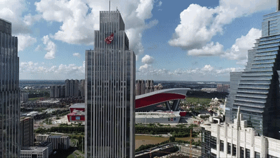 与国家会展中心一街之隔的“绿地全球商贸港”,曾被“新闻联播”点赞,从中,你已经可以窥见了东北亚国博城的未来。