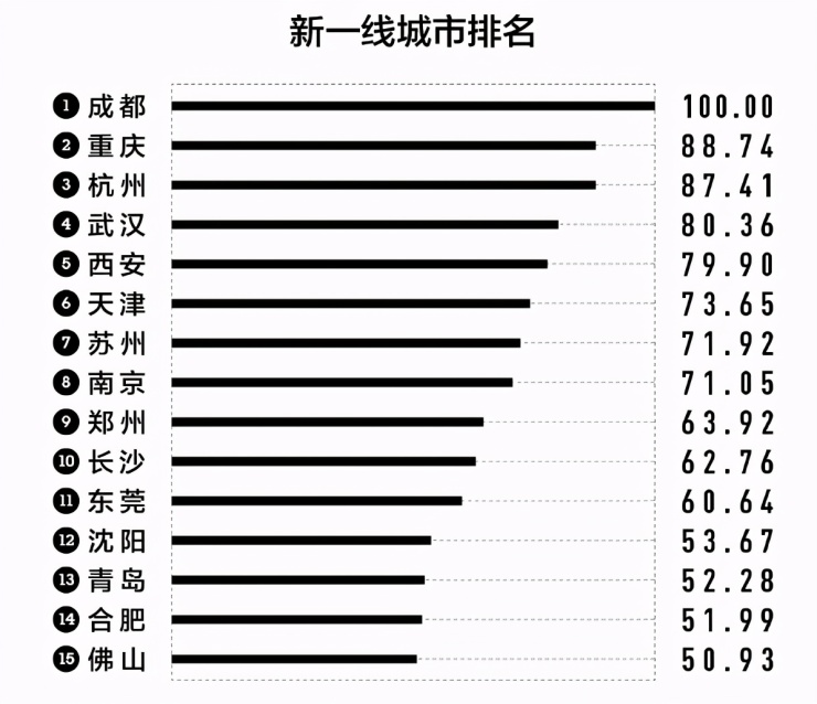 与年轻人争相逃离的东北城市不同,成都却是年轻人争相来到的地方。2020年中旬,《2020城市商业魅力排行榜》发布,按照商业资源集聚度、城市枢纽性、城市人活跃度、生活方式多样性、未来可塑性五个方面作为一级维度来评估城市。15个进入“新一线”的城市依次是:成都、重庆、杭州、武汉、西安、天津、苏州、南京、郑州、长沙、东莞、沈阳、青岛、合肥、佛山,成都满分排名首位。