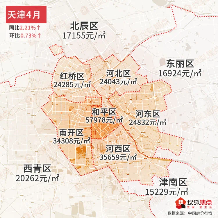 天津4月均价为25798元/㎡同比上涨2.21%↑,环比上涨0.73%↑