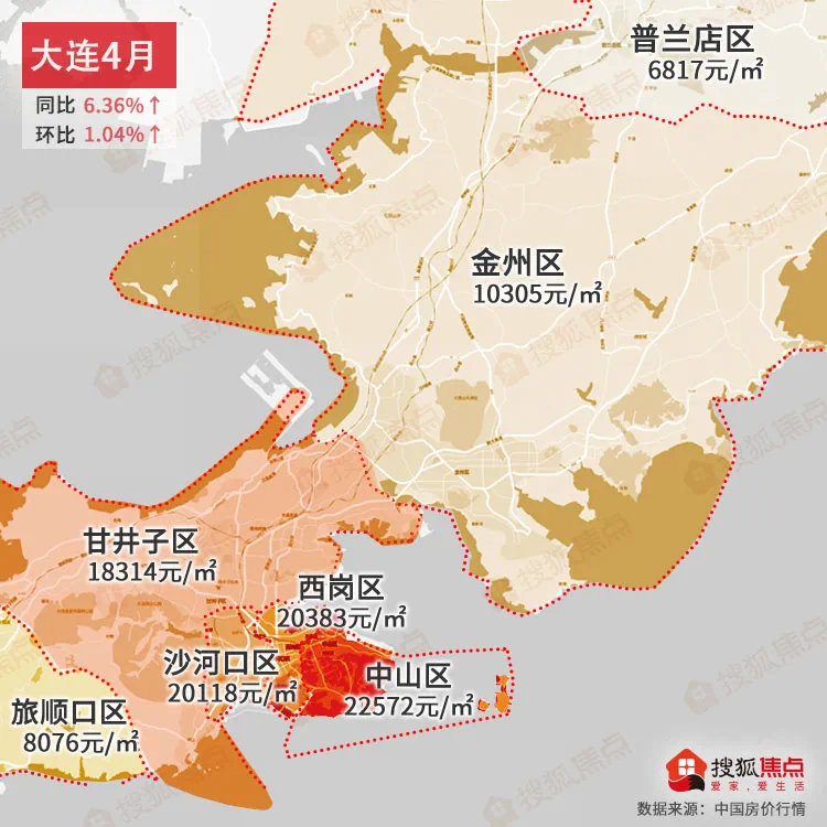 大连4月均价为16730元/㎡同比上涨6.36%↑,环比上涨1.04%↑