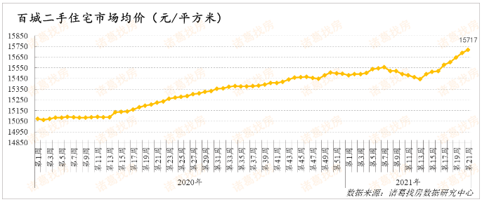据诸葛找房数据研究中心监测数据显示,2021年第21周百城二手住宅市场均价为15717元/平方米,环比上涨0.18%,涨幅较上周收窄0.1个百分点。自14周起二手房市场均价连续八周呈现上升趋势,整体市场呈现稳中向好的态势,随着楼市小阳春的逐渐褪去,市场季节性回落,预计短期市场均价涨幅将进一步收窄。