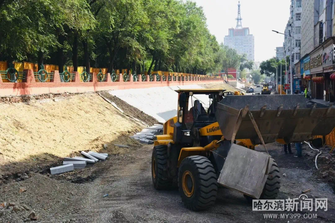 16日,在道外区钱塘街施工人员开始铺设护坡工作,护坡上的护栏已经安装完毕。