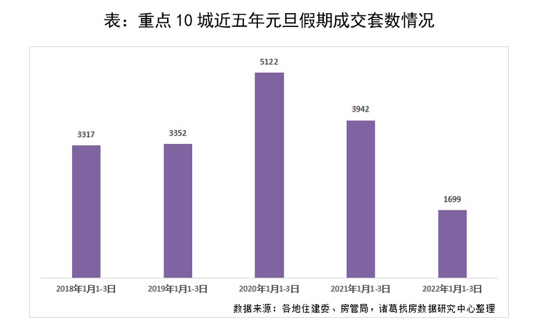 1月4日,诸葛找房数据研究中心发布2022年元旦假期全国重点城市成交报告,数据显示,2022年元旦期间,重点监测的10个城市新房成交1699套,较2021年12月同期下降60.12%,较去年元旦同期下降56.90%。诸葛找房数据研究中心报告指出,整体来看,2022年初楼市回温凸显一定的乏力姿态,尽管2021年11月、12月政策端接连释放改善信号,短期内带动成交有所回升,但政策对市场的引导作用仍需较长时间消化。报告显示,2022年初,部分城市“限跌令”犹存,个别城市亦推出年初楼盘涨价通知,加之前段时间开发商由于资金及项目质量问题引发的危机也不可忽视,导致购房群体的观望情绪仍然较浓。另外,节假日期间,疫情防控工作收紧,楼市线下销售活动有所受阻,多重因素导致新房成交呈现走低态势。