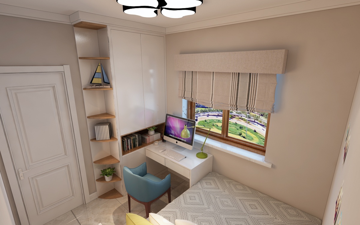 次卧还兼着书房功能,榻榻米+书桌,再结合一组的收纳柜,整个空间都实用得很。