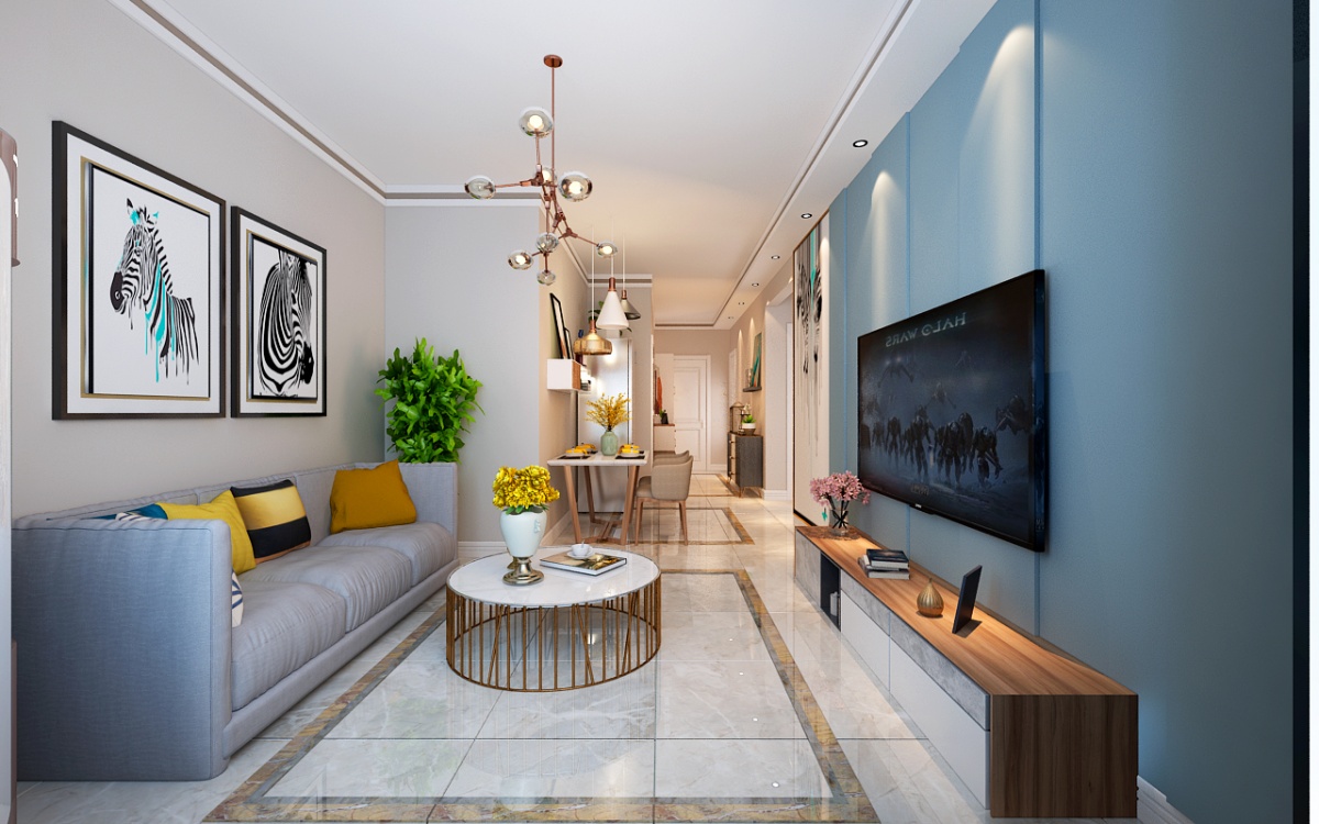 客厅有一面敞亮的大窗户采光不错,灰蓝色的烘托也是极好的哦!