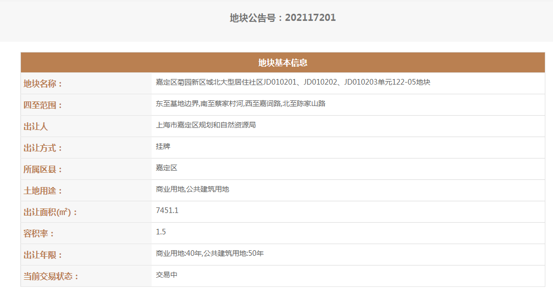 另一宗为嘉定区菊园新区城北大型居住社区122-05地块,土地用途为办公楼、商业用地,出让面积为7451.1平方米,容积率1.5,建筑面积1.12万平方米,起价2795万元,起始楼面价2501元/平方米。该地东至基地边界,南至蔡家村河,西至嘉词路,北至陈家山路,地块出让范围内需设置建筑面积约1.12万平方米的邻里生活中心,受让人应当按出让年限自持建筑面积不低于100%的菜场及其他商业设施。