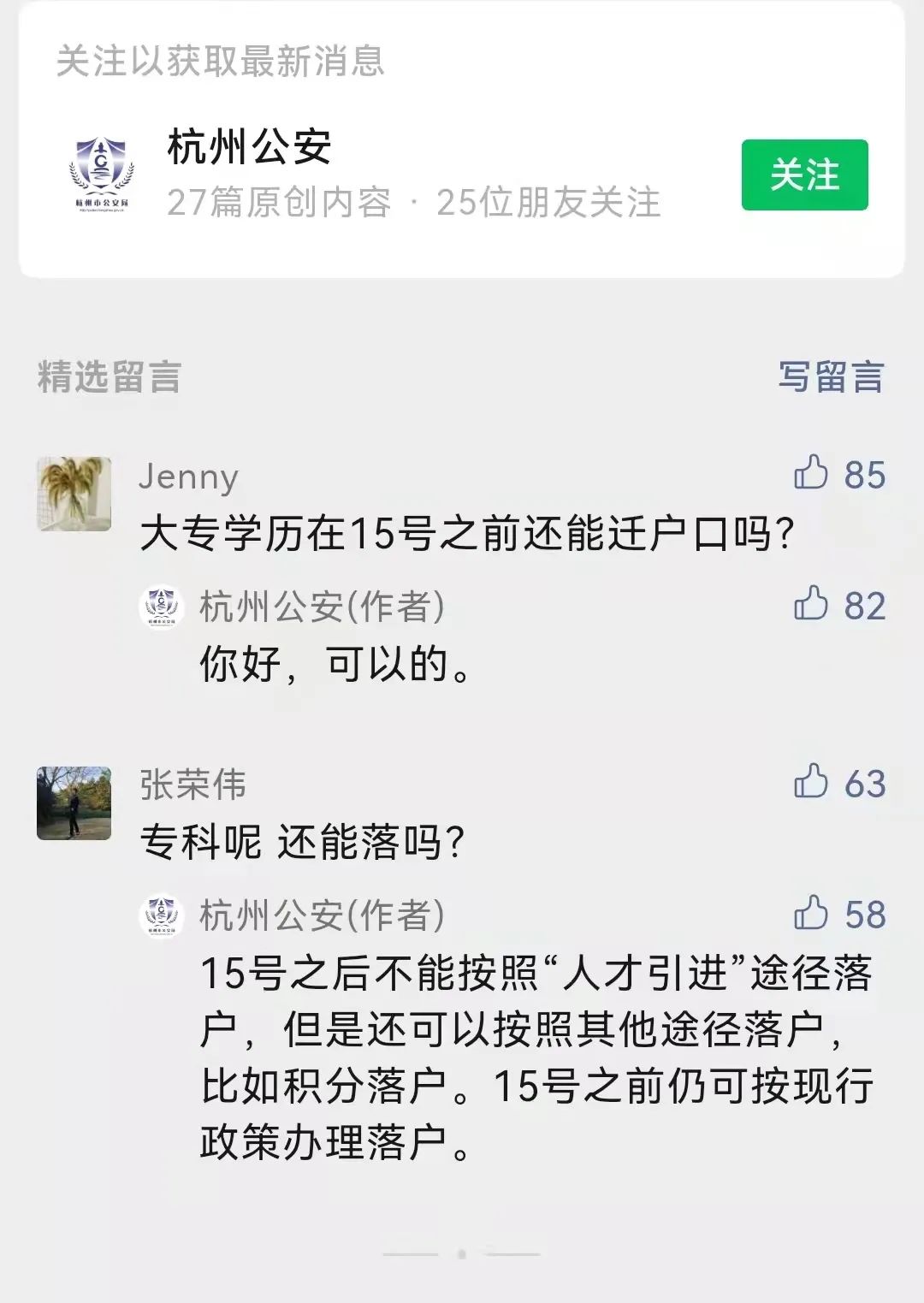 通读《公告》,可以发现,只提及本科及以上学历人才的落户,没有提及专科学历的落户。再来看以下官方留言,基本可以确认:杭州学历落户的门槛从大专调整为本科。