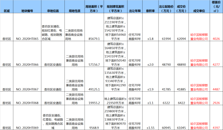 NO. 2020HT069位于香坊区安通街、红星街、电碳路、规划路围合区域,土地性质为二类居住用地兼容商业设施用地,面积9568.9平米,容积率≤1.55,出让起始价60945万元,成交价61045万元,溢价率0.2%,成交楼面价4397元/平米。