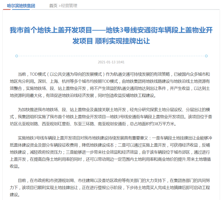 这两宗地块是哈市排名前列在地铁上盖的开发项目,采用TOD模式(以公共交通为导向的发展模式),简单话说就是“地铁上盖物业”,是集居住、就业、商务、商业、休闲、教育于一体的大型综合体,把生活中的各个场景和地铁有效地串联起来,让生活更加高效便利。深圳、上海、杭州等多个城市都先后按照TOD模式,整合地铁资源进行工程建设。杭州绿城在2015年即开始试水TOD建设,排名前列个项目是杭州的绿城杨柳郡,此后又在昆山、苏州、福州、宁波等城市投资了多个TOD项目。