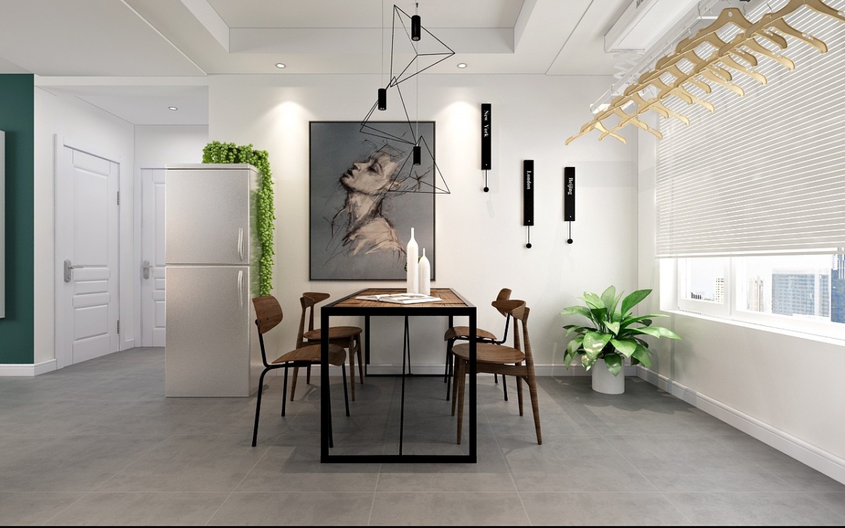 餐厅与客厅相连,餐桌同样是北欧风的木系艺术餐桌,吊灯艺术个性体现出主人的品味不一般。
