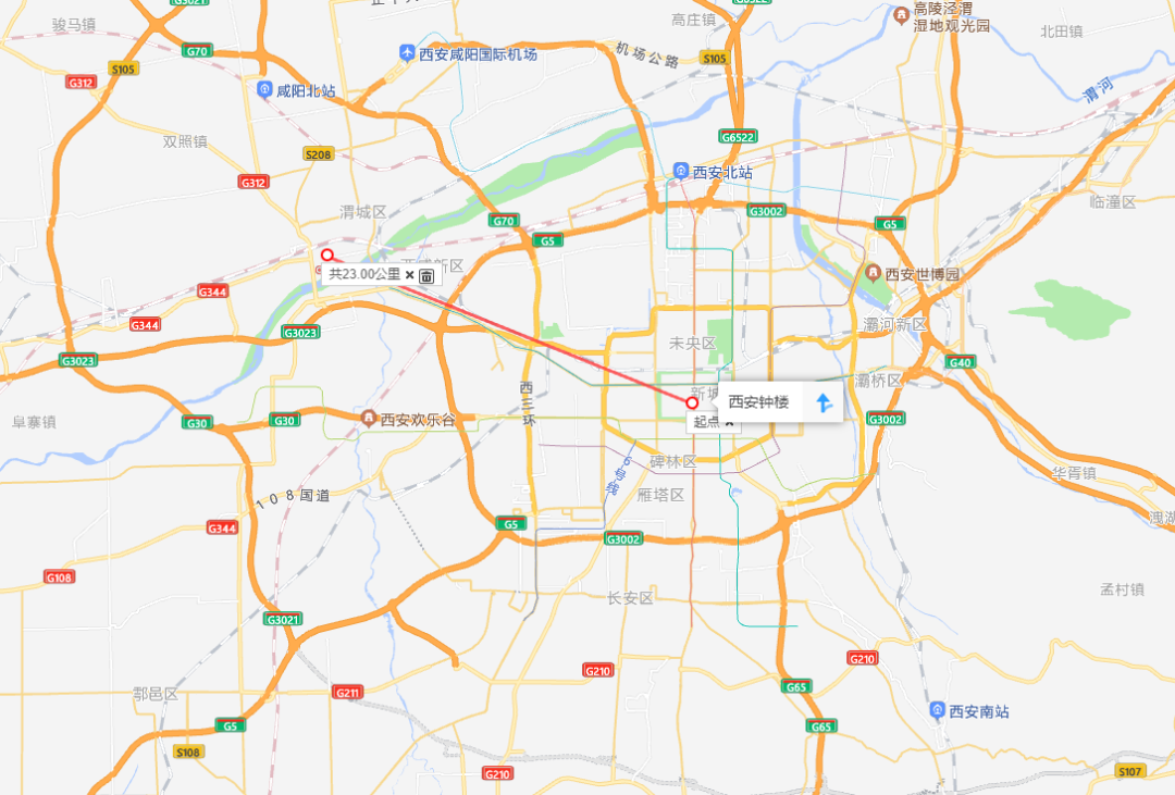 地图显示, 西安市中心钟楼到咸阳市中心人民广场直线距离仅23公里,开车25公里。