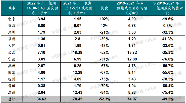 2022年“五一”假期部分重点城市新建商品住宅成交情况