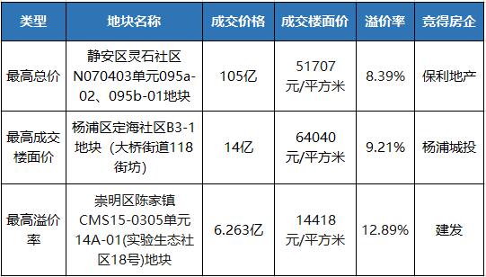 而溢价率较高地块为崇明区陈家镇CMS15-0305单元14A-01(实验生态社区18号)地块,成交楼面价14418元/平方米,溢价率12.89%,由建发以约6.26亿元竞得。