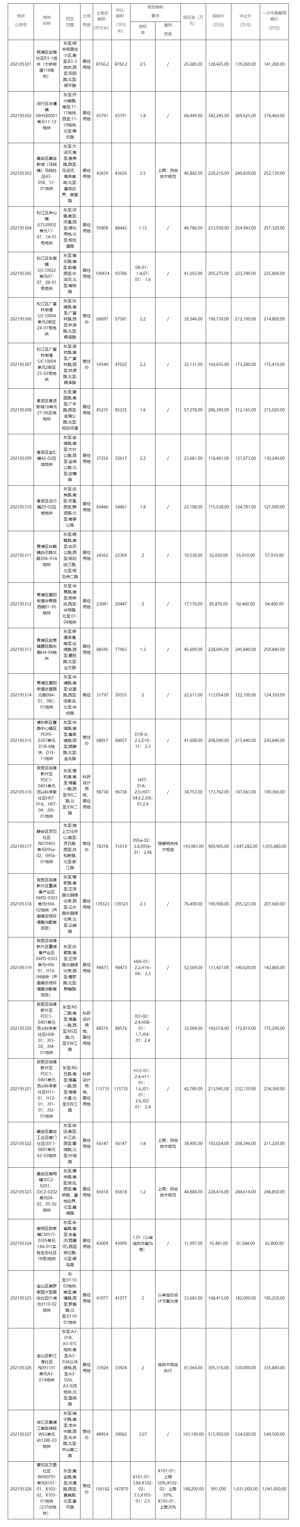 5月20日晚间,上海规划和自然资源局网站发布四则《上海市国有建设用地使用权出让公告》,也就是上海市排名前列批集中出56幅地块的详细出让公告,总起拍价达820.82亿元。