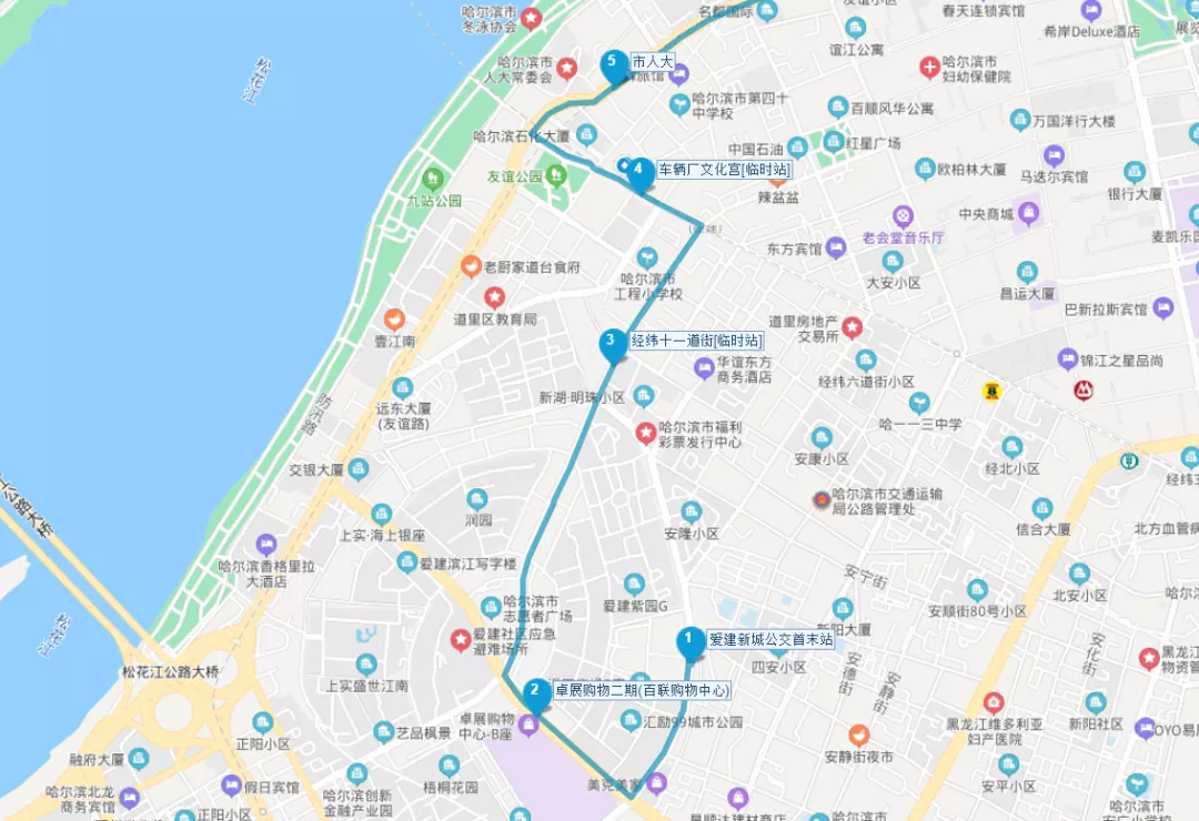 单向往果园小区方向:“上海街(焦氏眼科医院)”站、“龙江银行总行”站、“报业大厦”站、“人民广场”站。