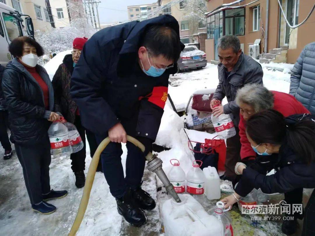香坊东电里小区因冻雨停电影响,造成封控的5号楼3单元和4单元停水,社区联系水务部门紧急送水。10日上午,市林草局下沉党员干部张岩在此封控单元执勤,他主动和社区主任一起为居民接水,天气寒冷,水溅洒在他的鞋和裤子上,风一吹湿透的裤脚都冻硬了……
