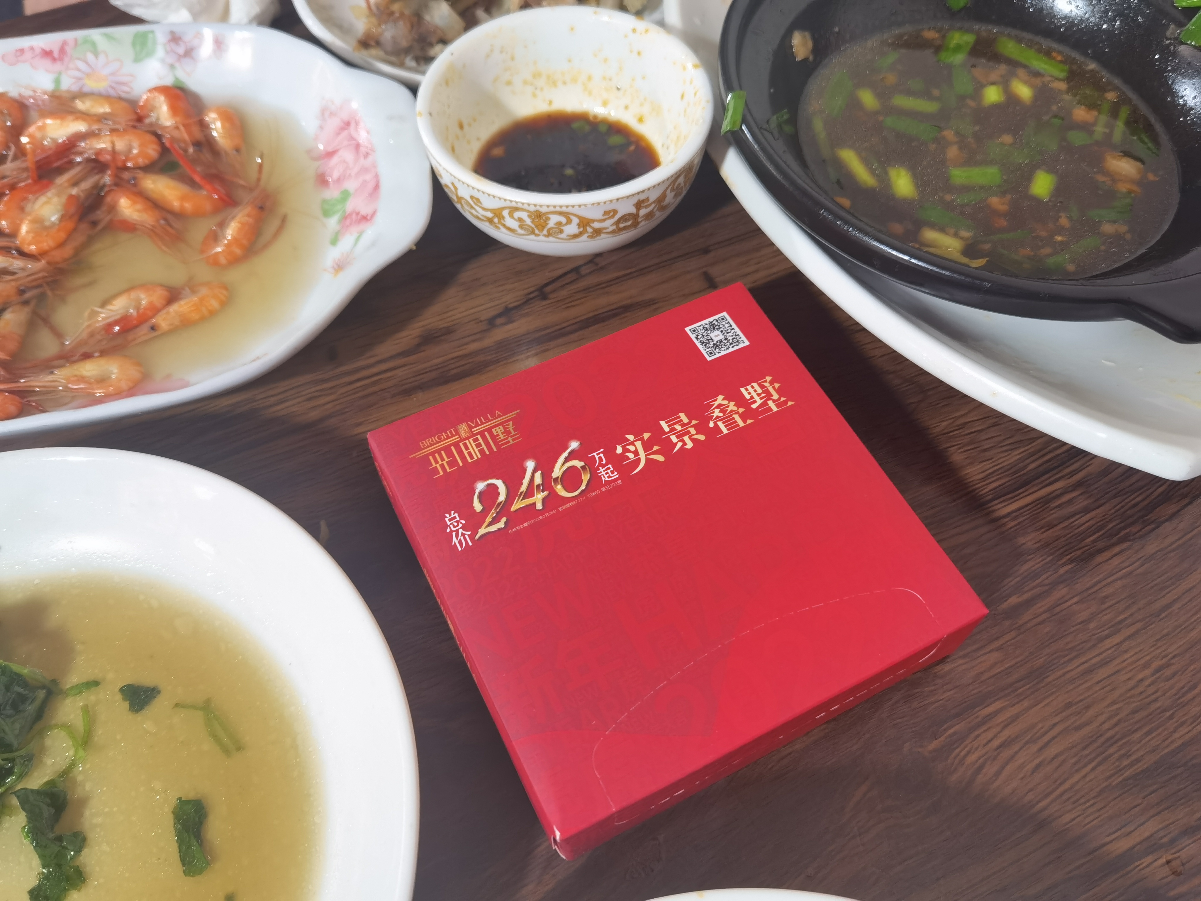 时代周报记者走访时发现,岛上的开发商都非常乐意支付推广费用,有些把项目的海报贴在饭店墙上,有些则机智地赞助起农家乐的纸巾盒。