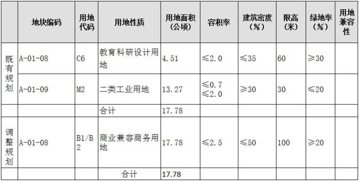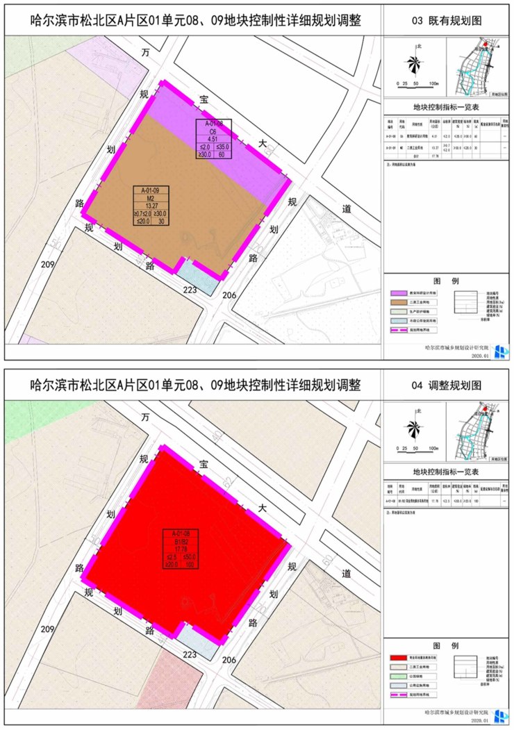 小编从哈尔滨市政府网站了解到,发生调整的地块位于松北区智谷大街、万宝大道、智谷四街、巨宝四路围合区域,用地面积约17.78公顷。本次规划调整将A-01-08、09地块由原规划的教育科研设计用地、二类工业用地调整为商业兼容商务用地并确定地块编号为A-01-08。调整后该地块容积率不大于2.5,建筑密度不大于50%,绿地率不小于20%,建筑限高为100米。