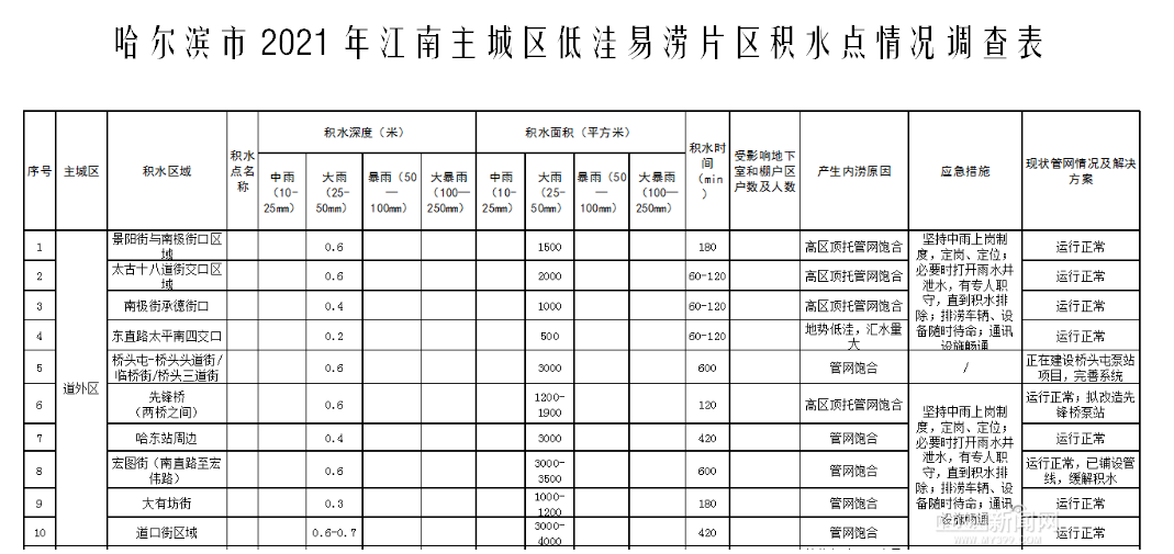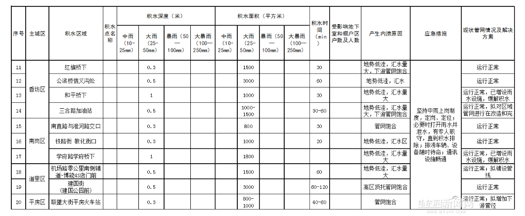 重点积水点——机场路零公里周边区域、建国公园周边区域、哈尔滨东站周边区域。