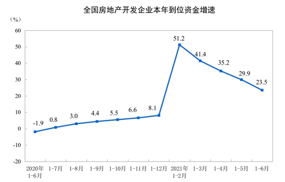 从到位资金方面看,1-6月份,房地产开发企业到位资金10.29万亿元,同比增长23.5%,较2019年同期增长21.1%,两年平均增长10.0%。其中,国内贷款1.35万亿元,下降2.4%;利用外资42亿元,下降9.1%;自筹资金3.02万亿元,增长11.9%;定金及预收款3.96万亿元,增长49.7%;个人按揭贷款1.64万亿元,增长23.9%。