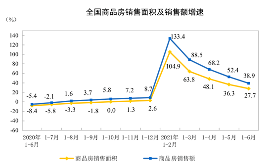 在商品房销售方面,据国家统计局数据显示,1-6月份,全国商品房销售面积8.9亿平方米,同比增长27.7%,较2019年同期增长17%,两年平均增长8.1%;其中,住宅销售面积增长29.4%。与此同时,1-6月份,全国商品房销售额9.3万亿元,增长38.9%,较2019年同期增长31.4%,两年平均增长14.7%。而从商品房销售面积和销售额增速的变动来看,近4个月均有所回调。