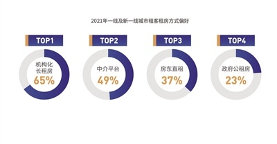 近年来,随着住房租赁市场的发展,机构化长租房成为城市年轻人的优选。《蓝皮书》显示,对于如何租到称心如意的房子,有65%的租客选择“机构化长租房”,位列首位,这一数据相较去年调研时上升9%。不少受调租客表示,经历过疫情影响时期,选择机构化长租房居住体验相对稳定,生活服务也更加全面,同时,APP等线上工具让找房更方便迅速。