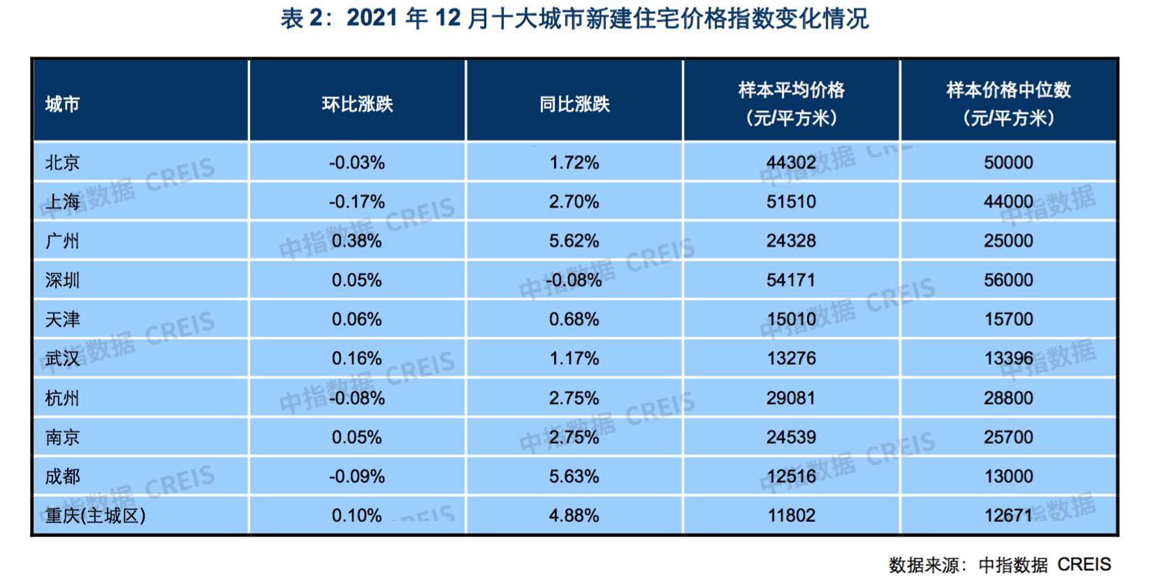 根据中指研究院公布的数据,新房价格下跌的城市中,南宁、衡水、威海、宜昌、湖州、沈阳、张家港、三亚、太原、廊坊这10个城市是价格下跌幅度靠前的城市。2021年12月,十大城市新建住宅平均价格为29294元/平方米,环比下跌0.04%,跌幅较上月收窄0.03个百分点。十大城市中,6个城市环比上涨,4个城市环比下跌。具体来看,广州、武汉新建住宅价格环比分别上涨0.38%、0.16%;重庆(主城区)、天津、深圳和南京环比涨幅均在 0.1%(含)内,其中深圳、南京涨幅最小,均为 0.05%。下跌城市中,上海环比下跌 0.17%;成都、杭州、北京跌幅则均在0.1%以内,其中北京环比下跌0.03%,跌幅最小。