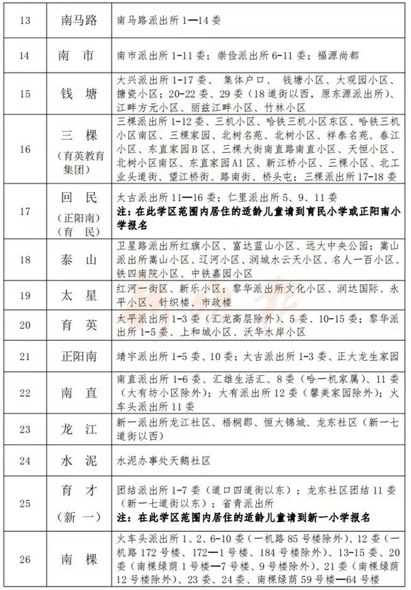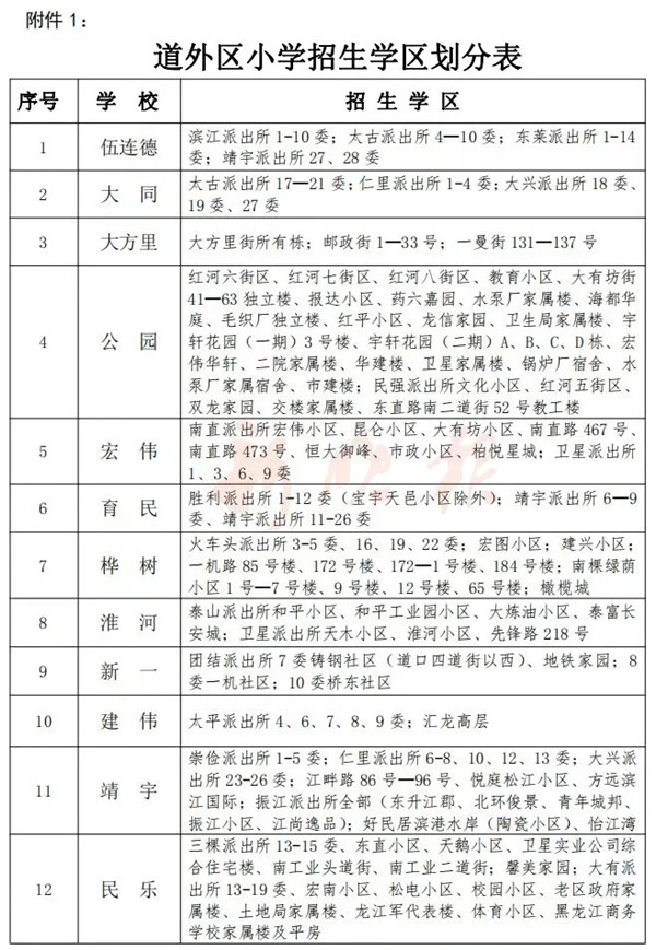 记者综合哈市教育部门信息获悉,随着6月15日哈市义务教育学校网上报名日期的临近,为了平稳有序做好2021年义务教育学校招生工作,遵循“两个一致”原则和“四零承诺”,南岗区、平房区、阿城区分别发布了各区2021年公办小学学区招生范围。道外区教育局发布了2021年道外区公办小学学区及对口初中。