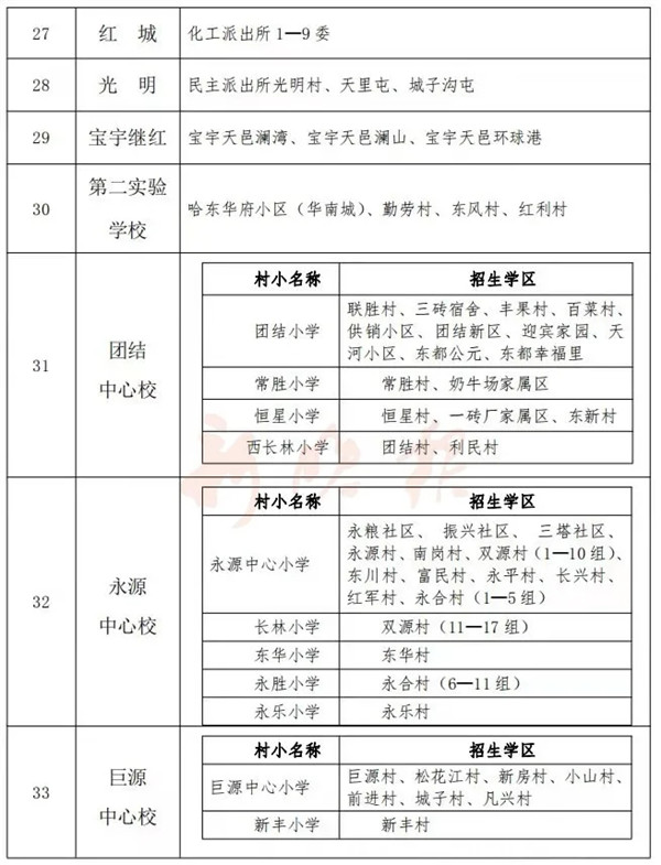 金源世家、金洋馨苑、新龙城、剑桥郡、六中家属楼、金都公司楼、阿什河街道新城村1-11组、南城村1-9组、白城村、双城村1-5组、东关村5-6组、融创达仁印象宸院、溪山美郡、诚信大街以南区域等。