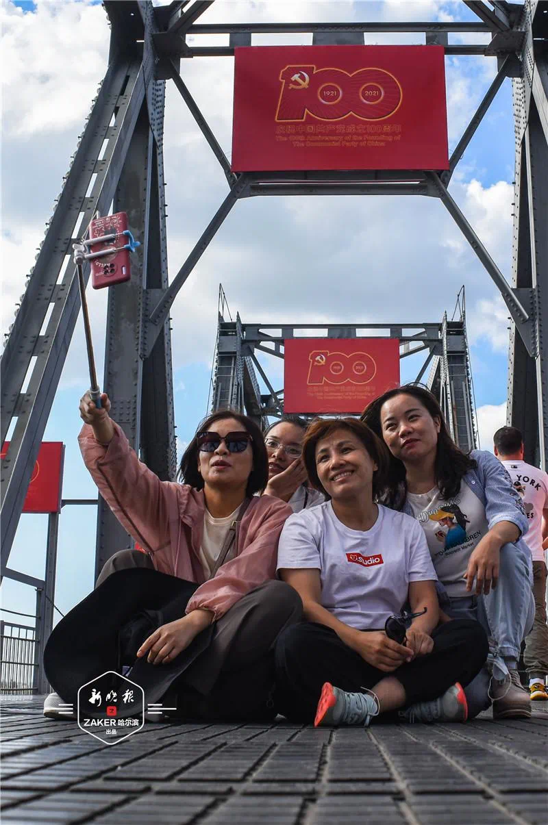 6月20日,记者来到还在施工中的“祝福桥”时,正赶上来自天津、四川等地的旅行团来到这里打卡游览。看到百年滨洲铁路桥在400余面红旗点缀下的壮丽景象,来自天津的廖女士拿出手机,在同伴的帮助下完成了自己与“祝福桥”的合影。